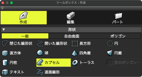 「ツールボックス」の「作成」 > 「形状」グループ > 「一般」(または自由曲面、ポリゴン) > 「カプセル」を選択します。