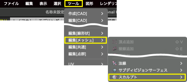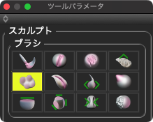 「ブラウザ」でポリゴンメッシュを選択して、メインメニュー > 「ツール」 > 「編集[メッシュ]」 > 「スカルプト」、または「ツールボックス」 > 「編集」 > 「メッシュ」 > 「編集」グループ > 「スカルプト」で表示される「スカルプト」や各種ブラシなどの項目を選択して起動します。