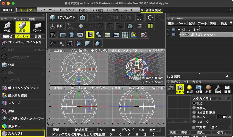 Shade3D Ver.26.0から搭載された「スカルプト」機能を使用してポリゴンメッシュ形状に対して粘土をこねるように直感的に編集を行うことを「スカルプトモデリング」とShade3Dでは呼んでいます。