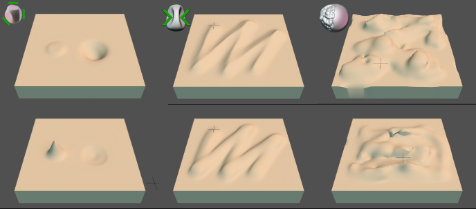 ・ブラシカーソルよりも上にある頂点を掘り下げる、または下にある頂点を盛り上げます。