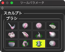 「ブラウザ」でポリゴンメッシュを選択して、メインメニュー > 「ツール」 > 「編集[メッシュ]」 > 「スカルプト」、または「ツールボックス」 > 「編集」 > 「メッシュ」 > 「編集」グループ > 「スカルプト」で表示される「スカルプト」や各種ブラシなどの項目を選択して起動します。