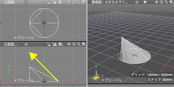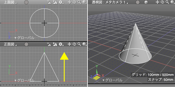 側面となる「正面図」を高さ方向、ここでは上にドラッグします。ドラッグした垂直の距離を高さとする「円錐」が作成されます。