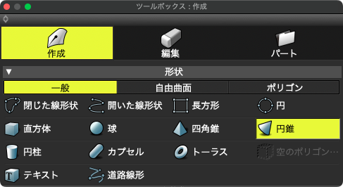 「ツールボックス」の「作成」 > 「形状」グループ > 「一般」(または自由曲面、ポリゴン) > 「円錐」を選択します。
