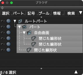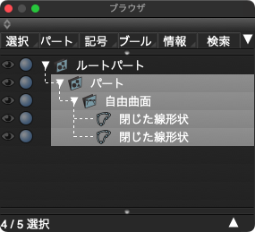 「一般」と「自由曲面」の場合は「自由曲面」と下面となる「閉じた線形状」を含む「パート」、「ポリゴン」の場合は「ポリゴンメッシュ」で作成されます。