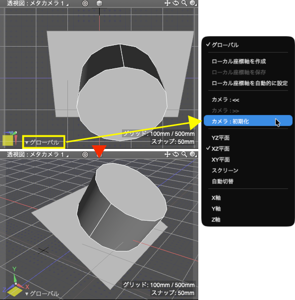 「作業平面コントローラー」の操作で変化した「透視図」の視野/アングルを初期設定に戻したいときは「座標系」ポップアップメニューから「カメラ:初期化」でシーン作成時のカメラに戻すことができます。