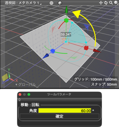 ここでは回転後に表示される「ツールパラメータ」に数値指定をして「60度」回転させました。