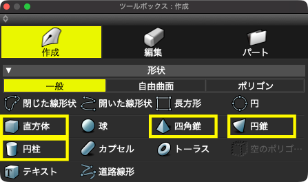 ここでは「ツールボックス」 > 「一般」 > 「形状」の中から「直方体」、「四角錐」、「円錐」「円柱」を作成します。