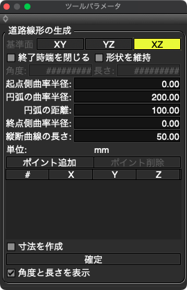 - 「道路線形」を作成する平面を選択します。「XY」、「YZ」、「XZ」から選択します。