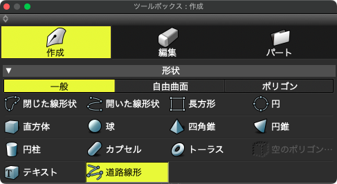 「ツールボックス」の「作成」 > 「形状」グループ > 「一般」(または自由曲面) > 「道路線形」を選択します。