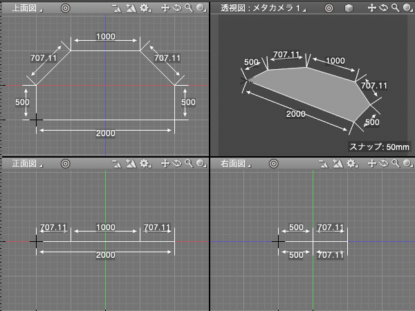 「上面図」を3箇所クリックして折れ線を作成します(図:1、2、3)。このまま次の手順に移ります。